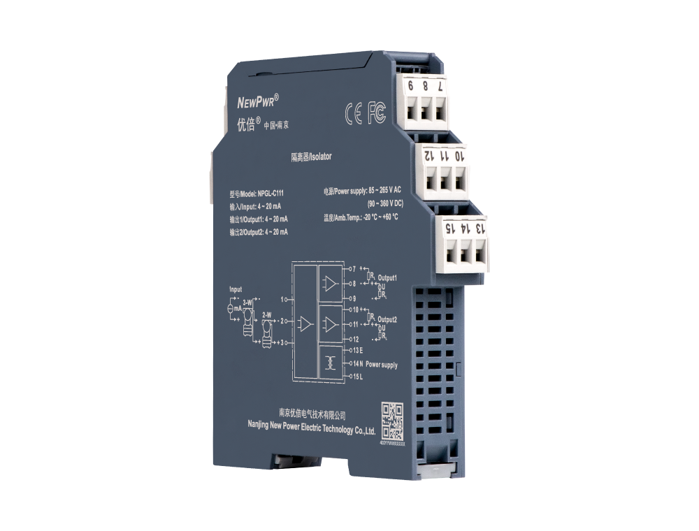 This isolator detects loop current and converts it to 4~20mA signals, and also provides transmitters with power. It needs an independent power supply. The input, output, and power supply are galvanically isolated from each other. Calibrate the apparatus or modify parameters by using a handheld programmer.