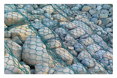 (3)鋅-5%鋁-混合稀土鋼絲包塑:在鋅-5%鋁-混合稀土鋼絲的表面包一層PVC保護層,再編織成各種規格的六角網。這層PVC保護層將會大大增加網的使用壽命,并且通過不同顏色的選擇,使其能和周圍的自然環境相融合