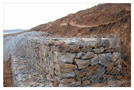 石籠網是由高抗腐蝕、高強度、具有延展性的低碳鋼絲或者包覆PVC的以上鋼絲使用機械編織而成,根據ASTM A 975和EN10223標準,所使用的低碳鋼絲直徑根據工程設計要求而不同。一般介于2.0-4.0mm之間,鋼絲的抗拉強度不少于38kg/m2,金屬鍍層重量一般高于245g/m2石籠網片的邊緣線直徑一般要大于網線直徑。其雙線絞合部分的長度不得小于50mm.以保證絞合部分鋼絲的金屬鍍層和PVC鍍層不受破壞。